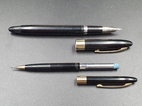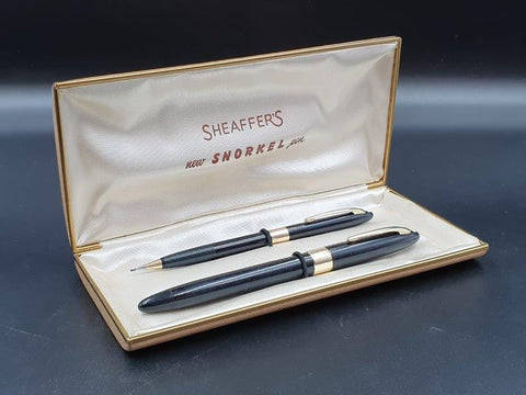 A vintage Sheaffer white dot Snorkel pen and pencil set in original case