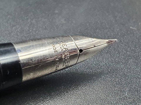 This vintage Sheaffer snorkel pen and pencil set is in great condition. There are instructions with to re fill the snorkel pen. The pen and pencil are in the original Sheaffer box. The pen is in need of an ink refill. The White Dot's original purpose was to indicate that the pen had a Lifetime guarantee. Early Sheaffer advertisements, beginning in 1924, point out that Lifetime pens, so marked by the White Dot were "unconditionally guaranteed for a lifetime This Sheaffer pen measures 16cm long, it is the perfect size for a wallet or purse. This pen and pencil are in good vintage condition with minor age and use related wear!
