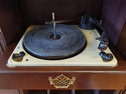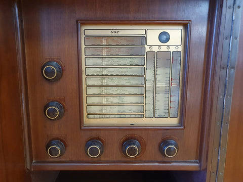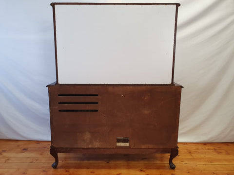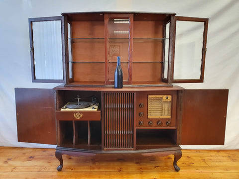 This solidly made vintage solid Imbuia Queen Anne footed Radiogram with an "GEC" radio and display cabinet/ showcase is a beautifully appointed cabinet and has loads of display place in the double door glass cabinet. We have not tested this radiogram and it is sold as is. The cabinet has beautiful period style metal handles. The cabinet measures 122cm long x 45cm wide x 152cm high. Please view the pics carefully to fully appreciate this stylish vintage radiogram show cabinet and to confirm the condition as they form part of the description.