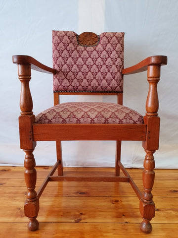 A vintage solid Oak solid back carver chair with an upholstered seat and back