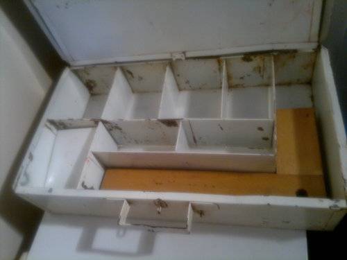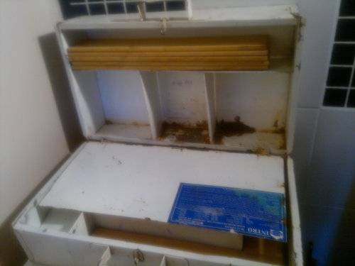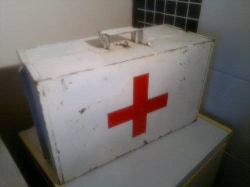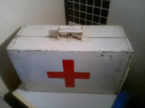 A Heavy Vintage Large Tin First Aid Kit. Opens up with both sides having compartments. 4 straight & 4 Elbow splints + 4 Joiner Plates included. Ideal for display in the Man Cave. Size: 530mm Long x 350mm x Wide x 210mm Deep. Sold as used second hand.