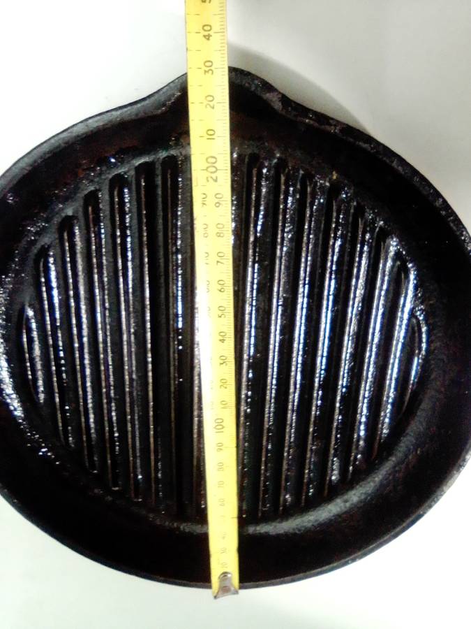 A well-seasoned cast iron grid skillet with flue. Sizes: 230mm across the flue x 255mm with handle and weighs 1.6 kg . Sold as used second hand. Please contact us to collect.