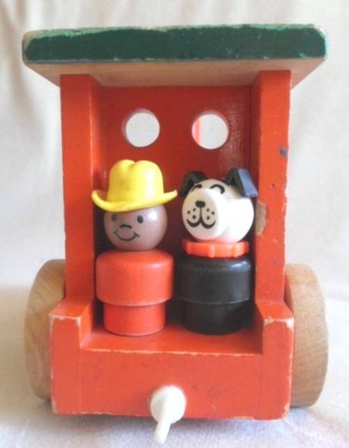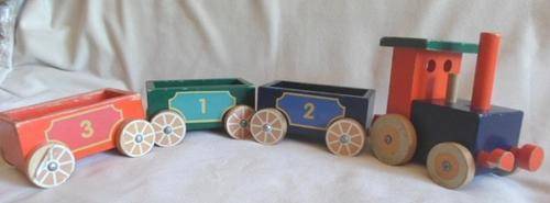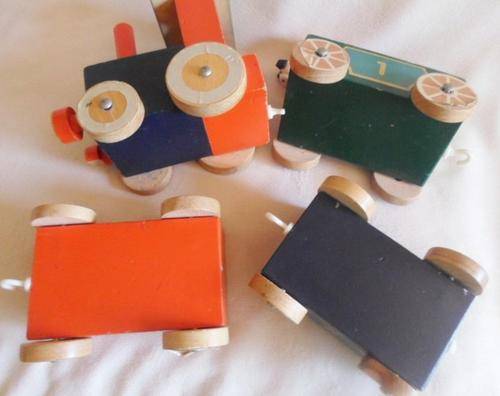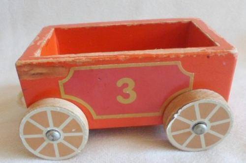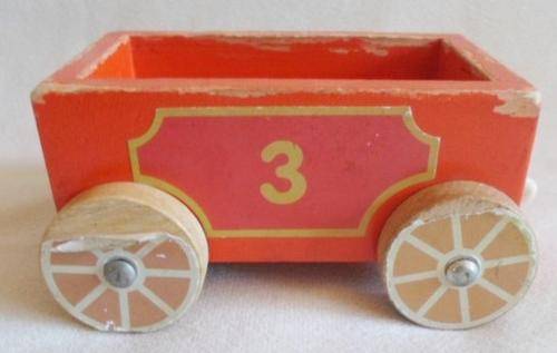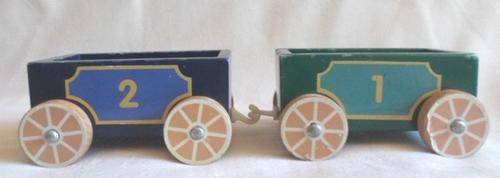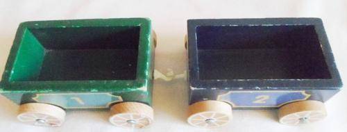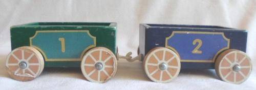 LOCOMOTIVE IS 15CM X 9CM X 12CM AND CARRIAGES 12CM X 7CM X 6CM. THE PLASTIC HOOKS ARE MISSING OR DAMAGED (BUT EASY ENOUGH TO REPLACE BY VISITING ANY HARDWARE STORE) AND TE ONE FRONT LIGHT OF THE ENGINE HAS DAMAGE. OTHER THAN THAT STILL VERY STURDY AND GOOD CONDITION. I HAVE ADDED TWO 'LITTLE PEOPLE' FROM A VINTAGE FISHER PRICE TOY AS I THINK THEY LOOK CUTE STANDING ON THE BACK OF THE ENGINE! REFER IMAGES