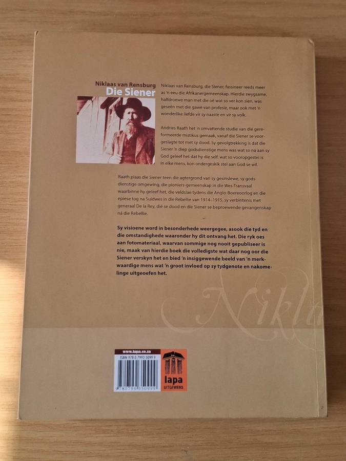 | Niklaas van Rensburg, die Siener, fassineer die Afrikanergemeenskap vir reeds meer as 'n eeu. Hierdie swygsame, halfdroewe man met die oe wat so ver kon sien, was met die gawe van profesie, maar ook met 'n wonderlike liefde vir sy naaste en vir sy volk geseen. Die Siener se visioene word in besonderhede weergegee, asook die tyd en die omstandighede waaronder hy dit ontvang het. Die ryk oes aan fotomateriaal - waarvan sommige nog nooit gepubliseer is nie - maak van hierdie boek die volledigste wat daar nog oor die Siener verskyn het en bied 'n insiggewende beeld van 'n merkwaardige mens wat 'n groot invloed op sy tydgenote en nakomelinge uitgeoefen het. |