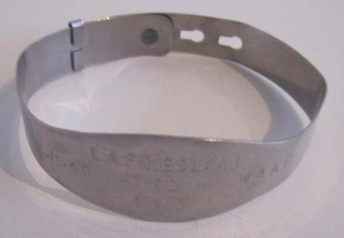 An identity bracelet dated 1940 worn by L.A.Frieslaar during WW11.There is a bull's head badge. I am not sure if it is military. See all images for this lot.