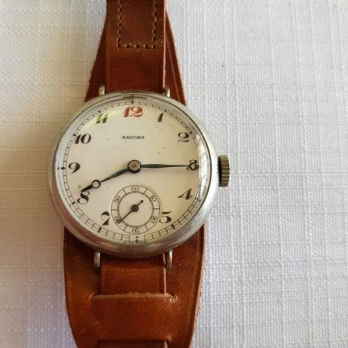 THIS WONDERFUL AND EXTREMELY RARE ANTIQUE (cWW1) ENGLISH MADE "ESCORT" GENTS STEEL TRENCH WATCH WITH A NEW LEATHER STRAP IS A TRULY STUNNING FIND, ESPECIALLY IN THIS CONDITION. THE ENAMEL WATCH FACE IS FREE OF BLEMISHED AND HAS NO VISIBLE SIGNS OF CHIPS. THE WATCH HAS A CASE DIAMETER OF 32mm AND IS IN COMPLETE WORKING CONDITION. THIS MECHANICAL WATCH ALSO HAS A SECONDS DIAL WHICH ADDS TO THE CHARM OF THIS INCREDIBLE 80-ODD YEAR OLD WATCH. THE TRENCH WATCH WAS A DEVELOPMENT BETWEEN A POCKET WATCH AND A WRIST WATCH AS WAS DESIGNED SPECIFICALLY TO BE DURABLE AND HARD WARING. THERE IS MINIMAL/ NORMAL AGE AND USAGE RELATED WEAR AND TEAR. PLEASE VIEW THE PICS CAREFULLY TO FULLY APPRECIATE THIS MAGNIFICENT ANTIQUE TRENCH WATCH AND TO CONFIRM THE CONDITION.