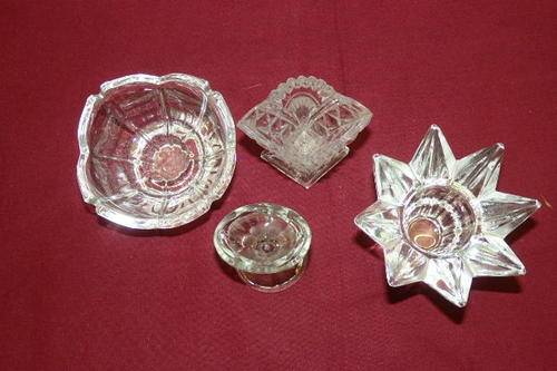 THIS WONDERFUL COLLECTION OF FOUR MIXED "SINGLE CANDLE " CANDLE STICK HOLDERS ARE IN GREAT CONDITION WITH NO VISIBLE CHIPS OR CRACKS IN THE GLASS AND MINIMAL USAGE RELATED WEAR AND TEAR. THE HOLDER RANGE IN SIZE BETWEEN 4.5cm AND 6.5cm TALL.