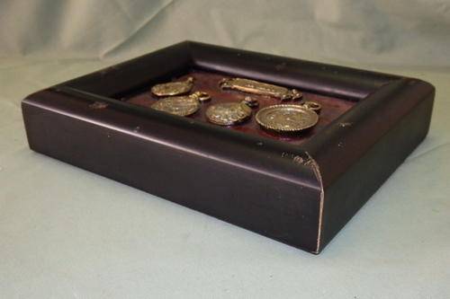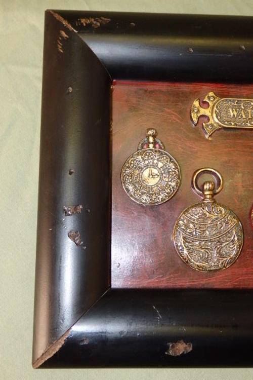 THIS WONDERFUL "DISPLAY" OF "FAUX" BRASS POCKET WATCHES IS IN A "VINTAGE STYLE" BOX FRAME AND MEASURES 24.5cm x 19.5cm. THE FRAME IS MADE TO LOOK OLD AND SCUFFED. THIS ORNAMENTAL DISPLAY WOULD BE AWESOME IN A PUB OR BAR.