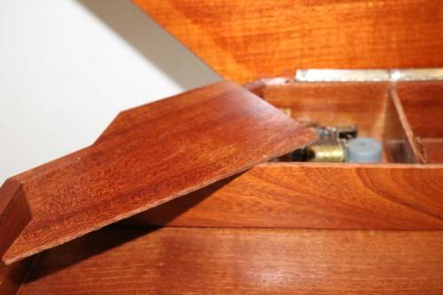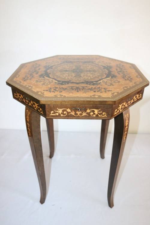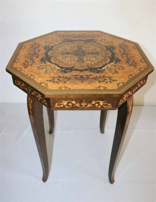 This absolutely beautiful Italian-made sewing box/ music table with gorgeous French lacquer detailing throughout the design of the table is in lovely condition and measures 45cm across x 56cm high. The table features a working music box inside that starts playing when the lid of the table is lifted. The table would be gorgeous in a living room, entrance hall or hallway with a beautiful mirror above it and a table lamp on it. The table has compartments inside and the legs unscrew to make the table very practical and easy to store. The table has minimal/ normal age and usage related wear and tear but it is still in great condition with minimal scratches etc. Please view the pictures carefully to fully appreciate this awesome and stylish Italian-made sewing box/ music table and to confirm the condition.
