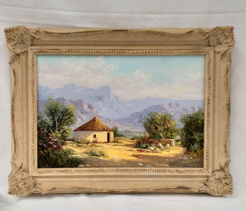 This wonderful mid-century original signed Reg (Reginald) A. Grattan landscape oil painting on canvas in a gorgeous period frame measures 61cm long x 45cm high and 47cm long x 31.5cm high in the frame. The painting depicts a tribal hut in the mountains and is signed and dated Reg A Grattan 1957. The frame is a lovely mid-century moulded frame and has some normal age and usage related wear and tear, but is still in great condition overall. The painting has some flaking, and would be worth spending some money having the painting cleaned and restored.