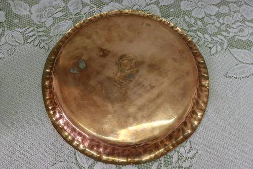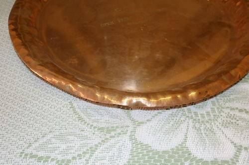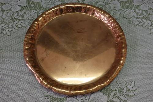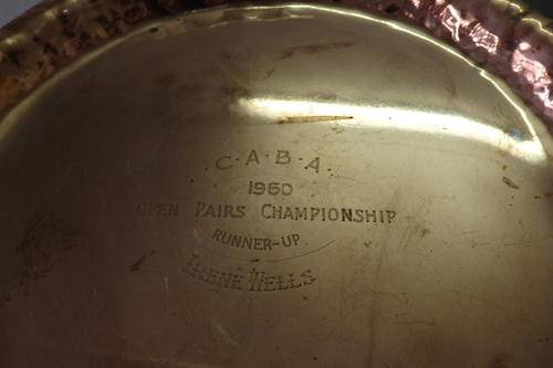THIS WONDERFUL OLD VINTAGE (1960) SOLID COPPER "TROPHY" TRAY/ PLATE WITH LOADS OF CHARM AND CHARACTER MEASURES 29cm ACROSS AND WAS AWARDED TO IRENE WILLS, THE RUNNER UP IN THE 1960 C.A.B.A. (I THINK IT COULD BE BRIDGE OR BOWLS) OPEN PAIRS CHAMPIONSHIP. THERE IS AGE AND USAGE RELATED WEAR AND TEAR AND BUMPS AND SCUFFS, BUT I THINK IT ADDS SOME CHARM TO TROPHY.