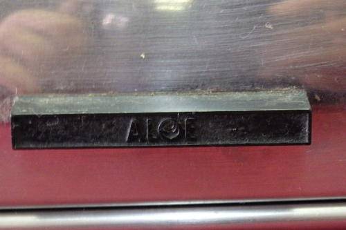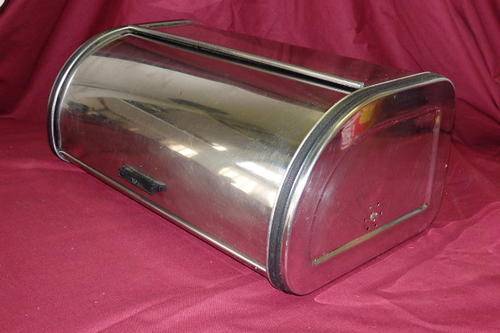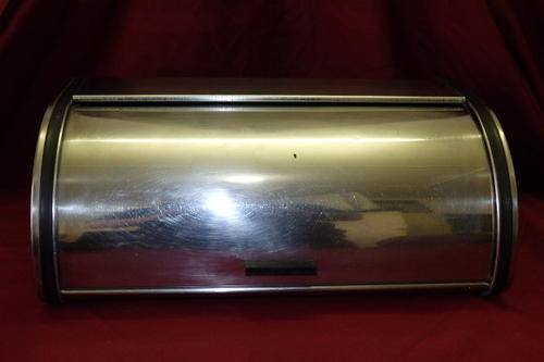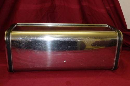 THIS WONDERFUL STAINLESS STEEL (POSSIBLY VINTAGE) "ALOE" BREAD BIN WITH BLACK PLASTIC DETAILING MEASURES 43cm LONG x 24.5cm WIDE x 17cm TALL. THERE IS AGE AND USAGE RELATED WEAR AND TEAR AND SCUFFS, BUT IT IT STILL A GREAT BREAD BIN.