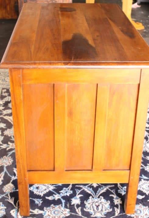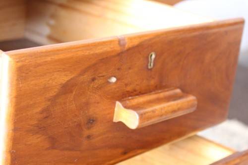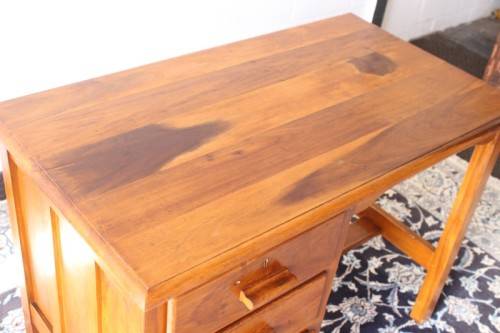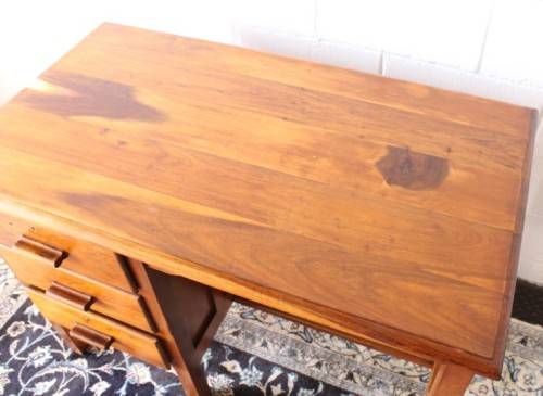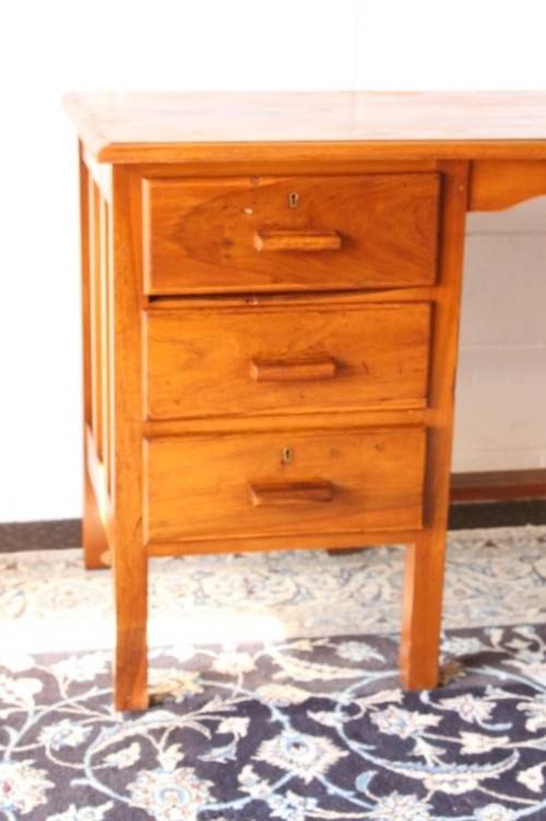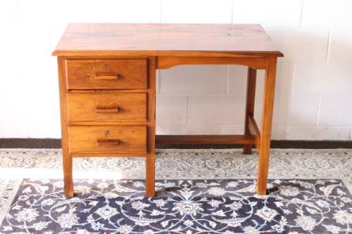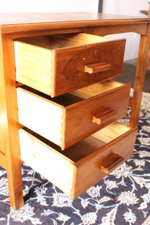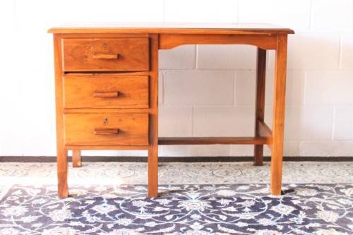This wonderful vintage compact 3-drawer desk is the ideal desk for a students bedroom or study or even a home office. The desk measures 105cm long x 59cm wide x 76cm high. The desk is in good vintage condition with normal age and usage related wear and tear and scuffs etc. This vintage desk sits solidly on the ground and would also be a lovely desk to shabby chic or to do a paint technique and put it in a retail store etc. Please note that there are no keys for the drawers and one lock has been removed. Please view the pics carefully to fully appreciate this wonderful vintage solid wooden desk and to confirm the condition.