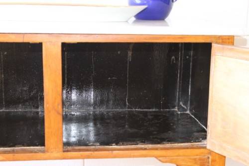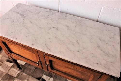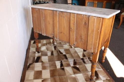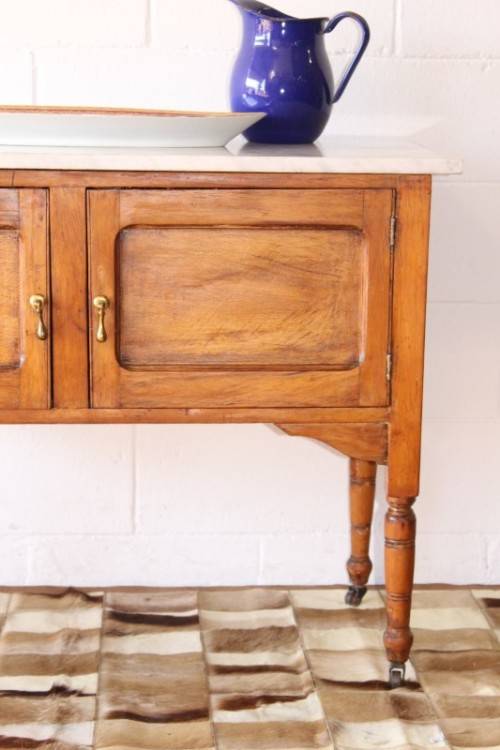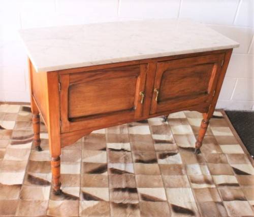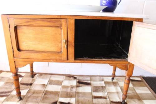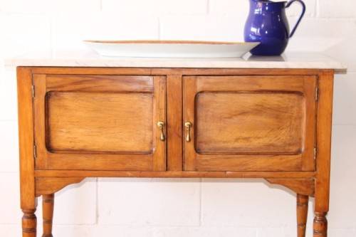 This beautiful vintage/ antique? solid Oak wash stand with a white/ grey marble top is in great condition for its age and is still on its original castors. The double-door cabinet has ample space for all your bathroom necessities and the wash stand measures 107cm long x 46cm deep x 77cm high. There is a little/ normal vintage age and usage related wear and tear and scuffs. The inside of the cabinet is painted in a black varnish? and the doors have brass tear-drop handles. The marble is loose on top of the frame which makes it easier to move. Please view the pics carefully to fully appreciate this stunning wash stand and to confirm the condition.