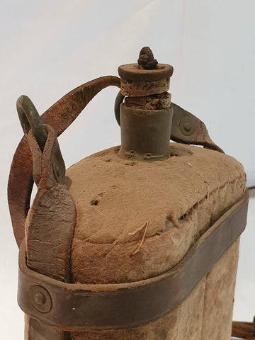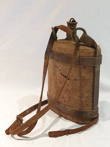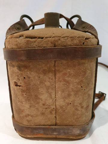 A water bottle with felt cover and leather straps in two rings around body of bottle, and strap up each side terminating in a brass ring with a stopper in mouth. This water bottle, cover and shoulder strap are in good condition and would be amazing for any collection of militaria. The bottle measures 16cm x 7.5cm x 23cmhigh. There are some tears in the fabric of the cover, we have not removed the bottle. Please view the pics carefully to fully appreciate this military water bottle and to confirm the condition