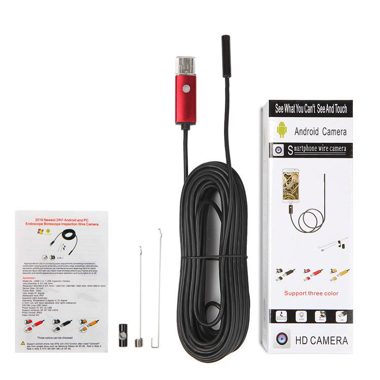 5.5MM Lens with 6pcs adjustable LED lights waterproof. 2M / 5M / 10M Long USB Cable. Black / Red / GoldColor for Optional. Power Supply 5V DC via USB.