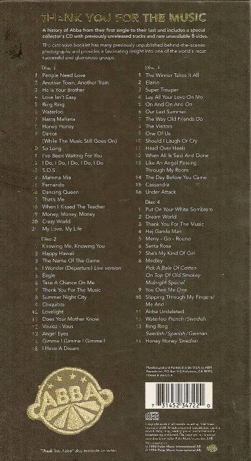 I have always liked so many of ABBA's BRILLIANT songs. This is an excellent box set of four cds[disc 1.has 21,disc 2.has 15,disc 3.has 16,disc 4.has 14,].
