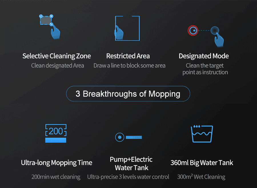 6. X6 has many powerful function since its camera triple navigation. You can direct X6 to clean specific spot on map, you can also set cleaing area or virtual barrier on APP map. X6 also can do breakpoint continuous cleaning .
