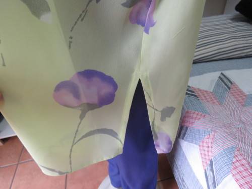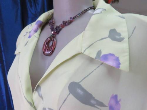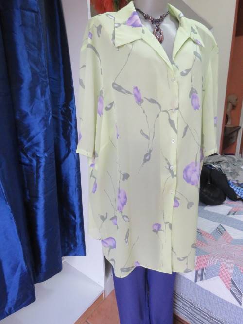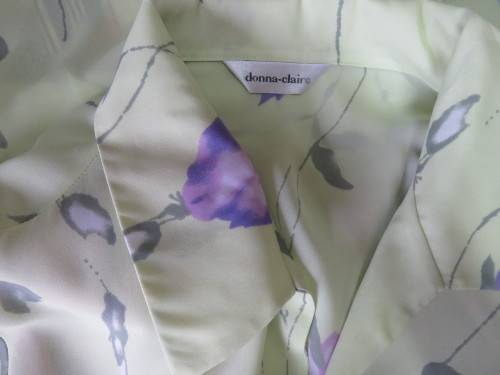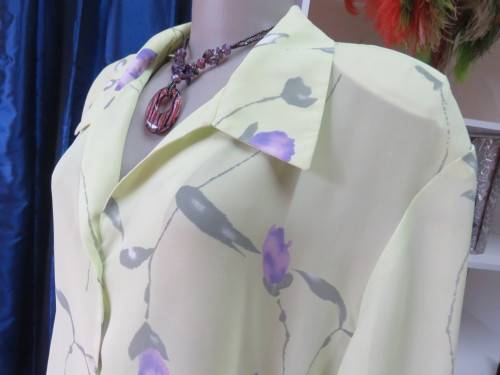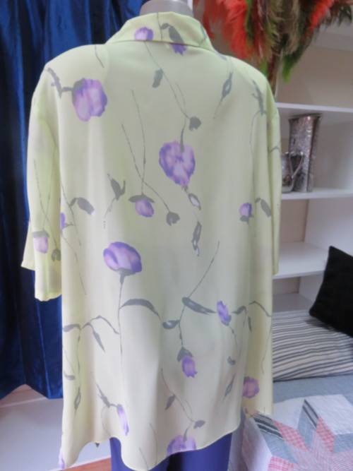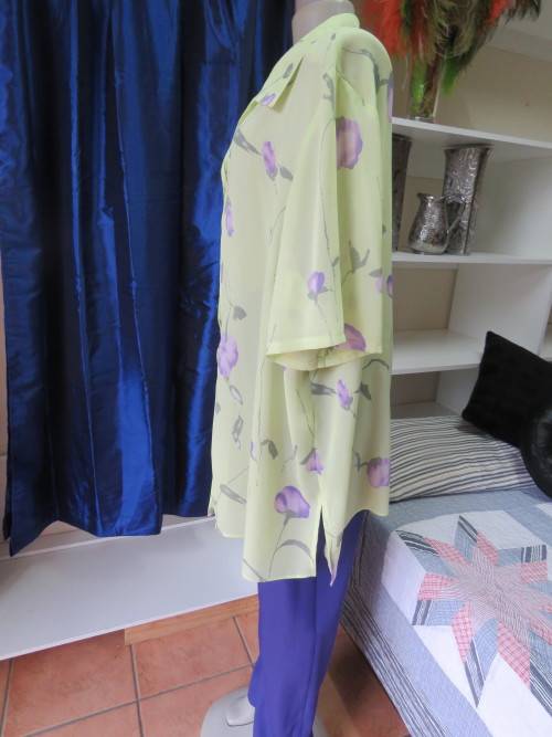 Absolute stunning yellow/green top with purple flower pattern.By 'DONNA CLAIRE' in 50/26.Short sleeves.Button down front with open collar.In 100% wash and wear polyester fabric with slitted sides.New cond.
