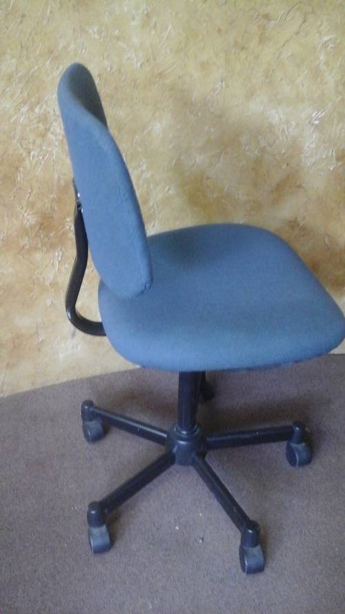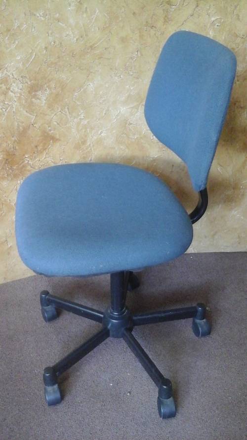 THE CHAIR OF THIS TERRIFIC PIECE IS SQUARE IN SHAPE. THE FRAME IS MADE FROM STEEL AND PLASTIC AND THE BACK REST AND SEAT HAS COMFY BLUE FABRIC CUSHIONING.