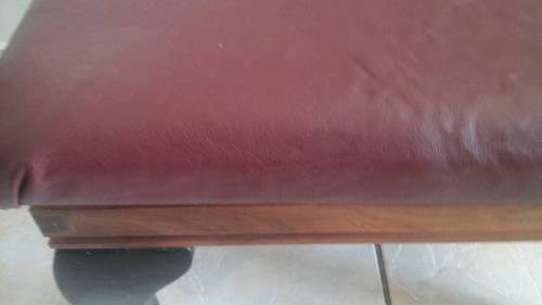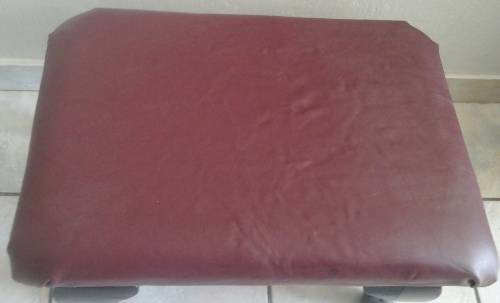 THE SEAT IS COVERED IN A MAROON LEATHER CUSHIONING.