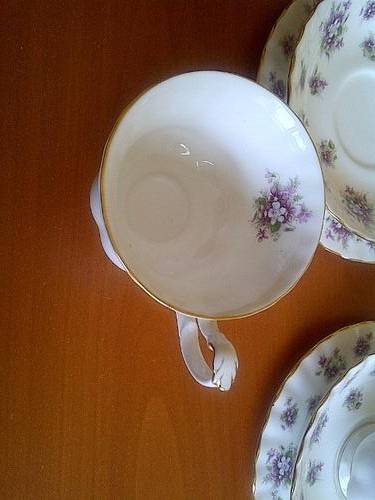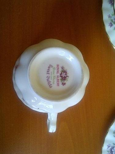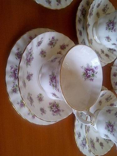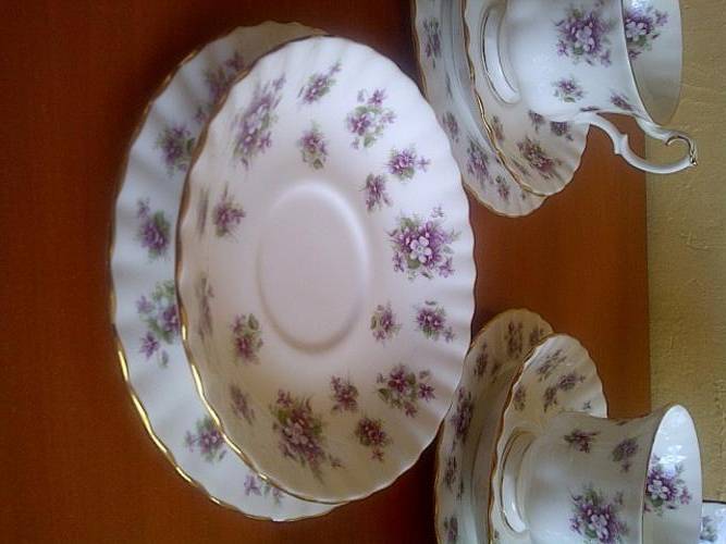 Up for your consideration is this gorgeous 16 piece "Sweet Violets" Royal Albert tea set in immaculate condition. The set consists of 5 trios and a spare sideplate all depicting the sweet violets theme, a white background with sweet violets in hues of purple and green foliage, with gold gilt work on the rims and edges. The set has been lovingly cared for and has no cracks, chips or crazing to any of the pieces.