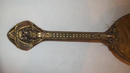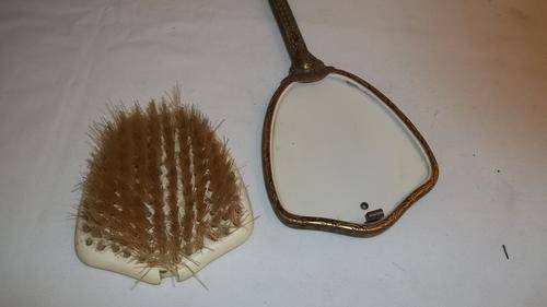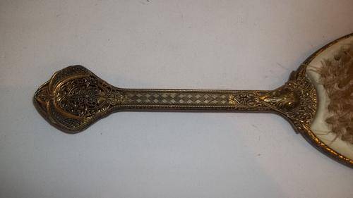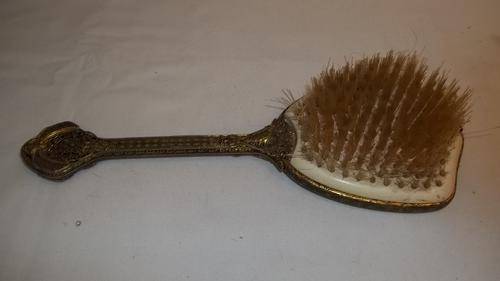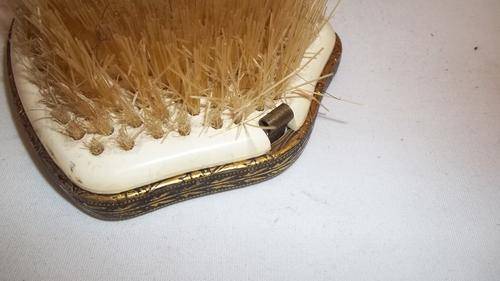 THE WORKMANSHIP ON THIS AMAZING DELINA DRESSING TABLE LADIES HAIR BRUSH IS TRULY AMAZING. THE DETAINING ON THE HANDLE AND THE REMOVEABLE BRISTLES MAKE THIS A PRETTY UNIQUE VINTAGE HAIR BRUSH. THE BRUSH MEASURES 26cm AND HAS A LITTLE WEAR AND TEAR WHICH IS TO BE EXPECTED. THE WHITE BRISTLE SECTION CAN BE REMOVED FOR EASY CLEANING.