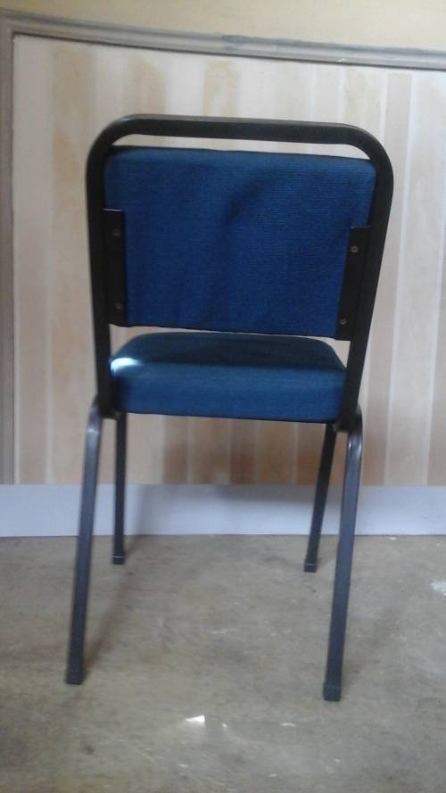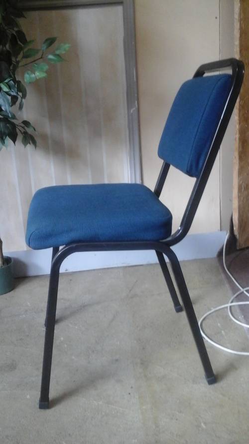 IT STANDS ON FOUR LEGS. THE SEAT AND BACKREST HAS A DARK BLUE FABRIC CUSHIONING.