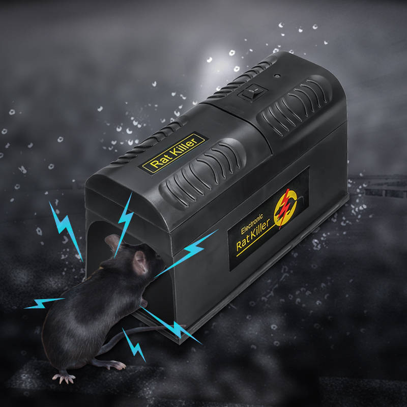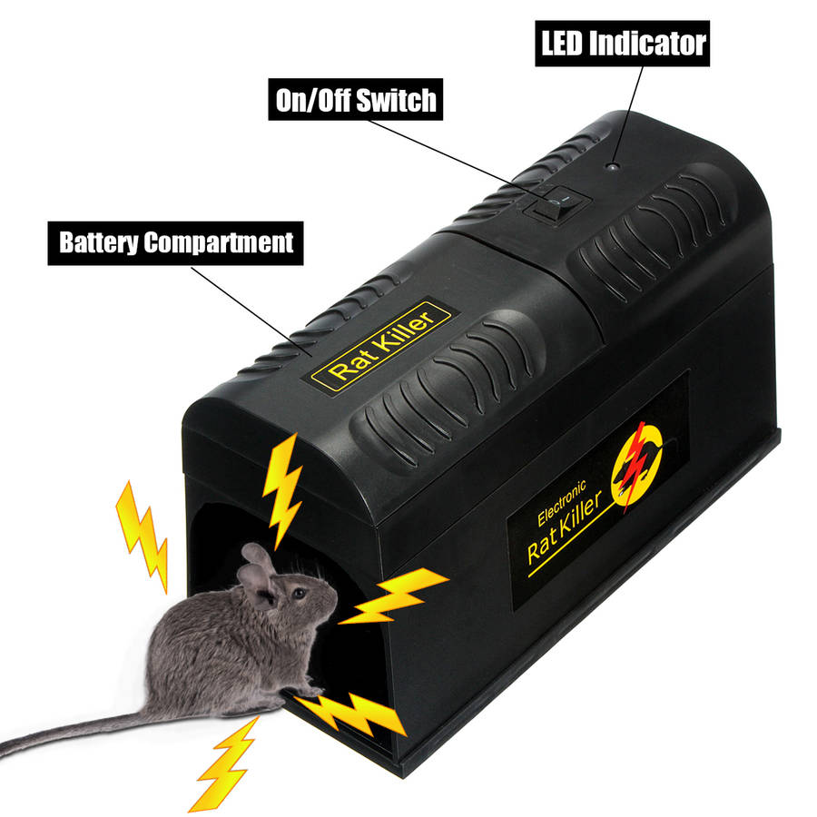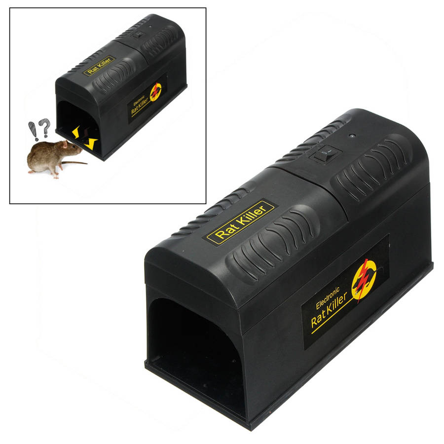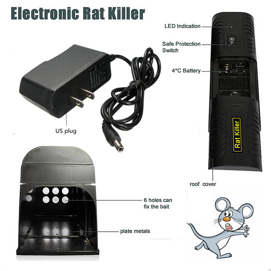Electronic Mouse Mice Rat Trap Rodent Killer Victor Control Zapper Pest US PlugSpecification:Color:blackWeight:662gMaterial: ABSSize:20.7 * 12 * 9cm / 8.1 * 4.7 * 3.5inAdapter cable length: 117cmAdapter plug: US plugAdapter input: AC 110-240V 50-60hzBattery: 4 * 1.5V C battery (not included)Static work current: ≤50uAHigh voltage working current: ≤380mAHigh voltage: 7000-9000VHigh voltage produced time: 4 minutesLow battery indicator: 4.8V±0.2VFeatureDelivers high voltage electronic shock to kill rat,nonpoisonous,safe and reliableSet with safety protection switch,in order to prevent mistake electric shock to personUse micro-electronic circuit technology for product design,low power consumptiom,suitable for long life operationLow bettery indicationApplication:This unit widely applies in dining-room,cookroom,bedroom,office,hotel and any places that rats usually appearOperation:Step 1: Put a piece of ham or bread (or any food rats prefer) into the cage deeply.Step 2: Insert 4 pieces of battery into battery compartment or directly use the DC-6V power adapter.Step 3: Identify location with rat activity look for worn trails or walkways. Place unit on the floor against a wall. Make sure the entrance in line with the trail, as Rats prefer to travel along walls.Step 4: Press switch to "On" position. Unit will be on, green LED will flash, indicating that the unit has been enabled. To prevent incidental electric shocks avoid contact with metal plates. Do not touch the bottom of the unit when unit is working.Package included:1 * Electronic Rat Killer1 * Power Adapter (US plug)1 * User Manual(English)More details: