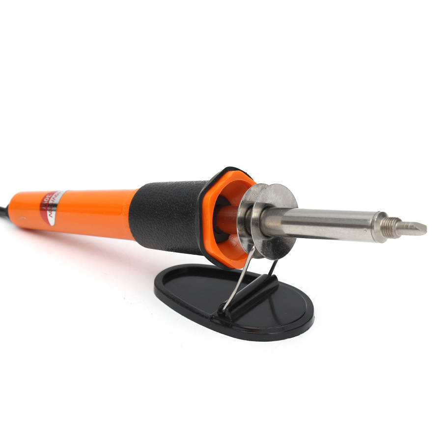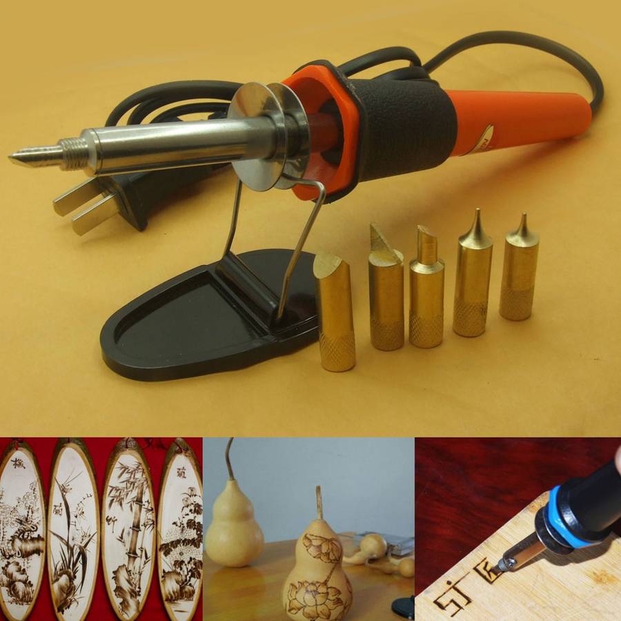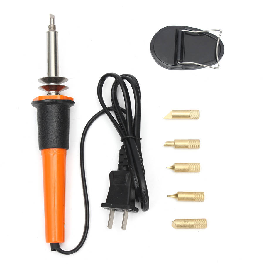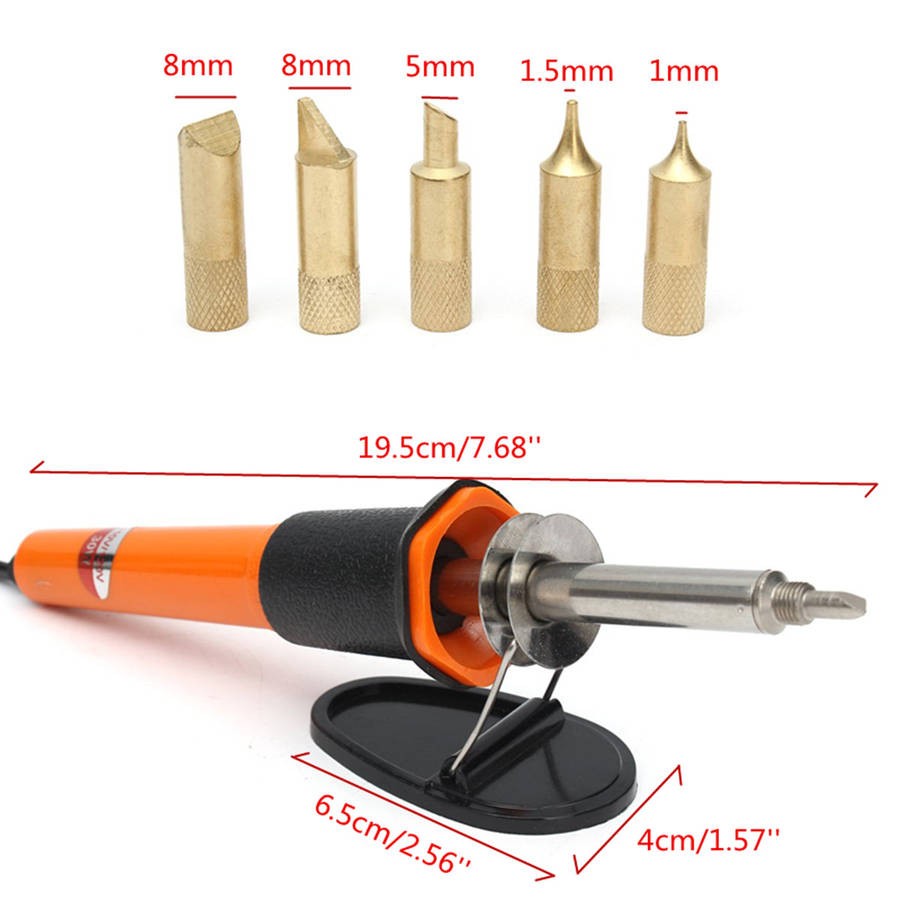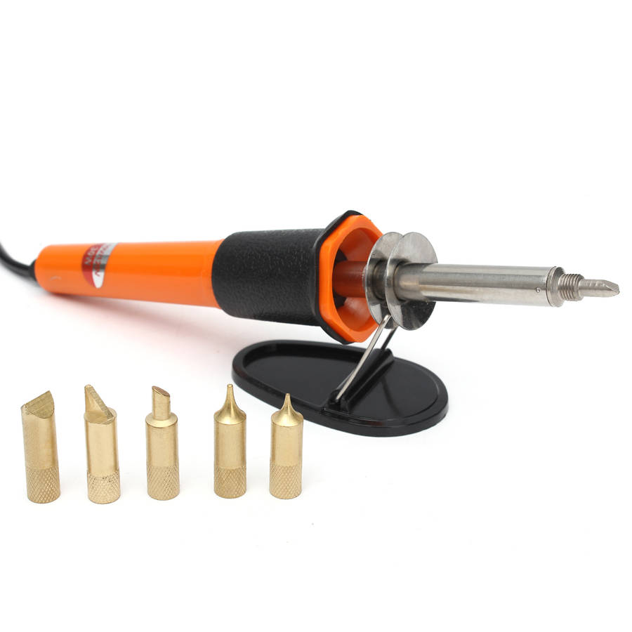 Excellent performance, corrosion resistance, advanced craft. Ideal for burning drawings, lettering and decoration on to wood, leather and cork, etc. For creative design or pyrography in wood and leather. Woodburning pen with comfortable grip, good to use. How To Solder 1. Clean the parts to be joined. 2. Clean soldering iron tip and “tin” all faces of tip with a coating of solder. 3. Heat parts (not solder) to be joined. 4. Apply flux-core solder to heated parts, not the soldering tip, and heat it till solder melts and flows freely. 5. Don’t apply too much solder unnecessarily. Attention: 1. When the soldering iron is plugged in for the first time, there comes out a smoke from the tip end. The smoke stops in a short while and a smoke never comes out again. 2. Use soldering stand and other aids to avoid burnt fingers. 3. Don’t pull the soldering iron tip outward and use it, it will shorten the heating element life. 4. After finish the works, cool it down naturally. 5. Don’t file the long life tip face.