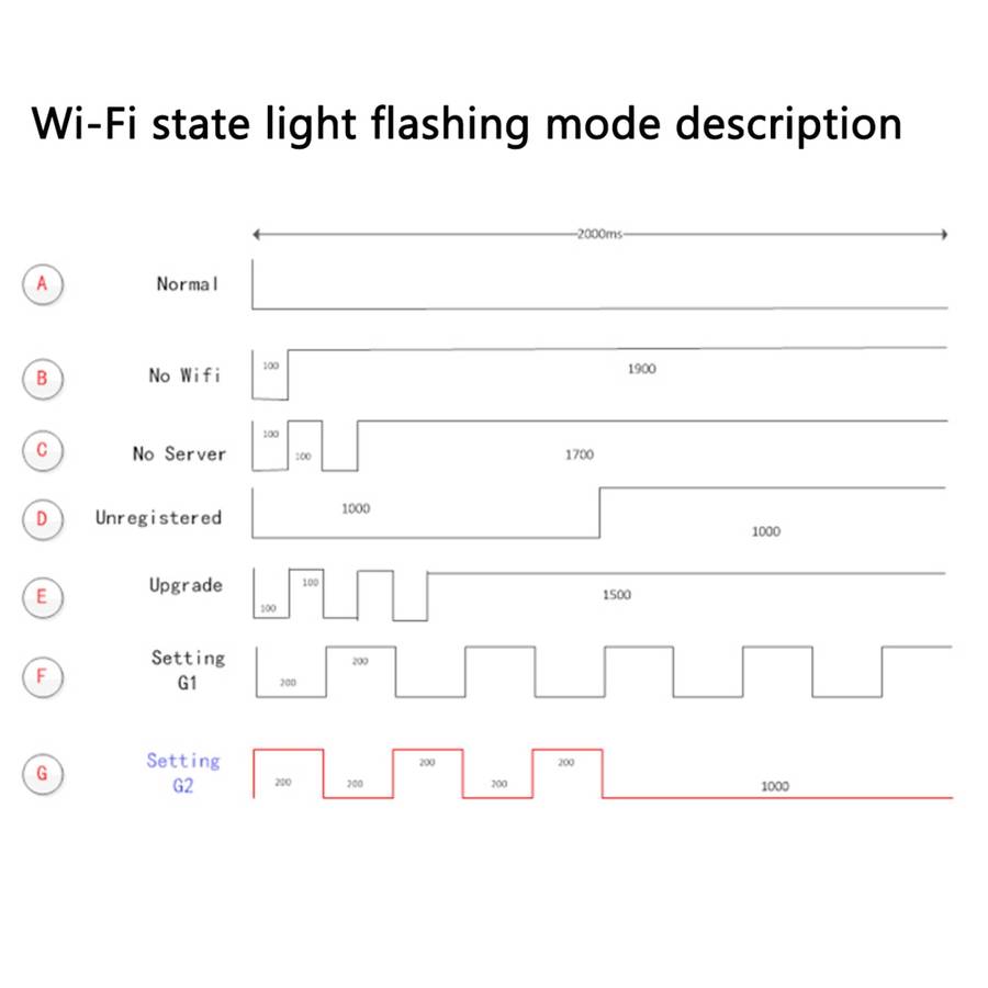 Usage: The flicker characteristic of WiFi state lamp is in 2 seconds, the low level lamp is high and the high level lamp is out. Detailed explanation of each state: A. Normal: device is working properly, and the connection with the cloud server is normal. APP can be manipulated at this time. In any other mode, the device can`t be controlled by APP. B. No Wifi: device cannot connect to wireless router. C. No Server: The device is connected to a wireless router, but cannot be connected to the server (that is, the commonly understood can not access the Internet ). D. Unregistered: indicates that the device has not been bound to any account. In general, devices need to be bound with eWeLink CoolKit accounts to communicate with cloud servers. The add device in Yi micro APP can complete the binding operation. E. Upgrade: indicates that the device is upgrading firmware. F. Setting G1: indicates that the device is in AP mode. Configuration mode is used for devices to obtain necessary information for mobile terminal APP to join the service network, including router ssid, password, server ip, port number, etc. G. Setting G2: indicates that the device is in ESPTOUCH mode. Configuration mode is used for devices to obtain necessary information for mobile terminal APP to join the service network, including router ssid, password, server ip, port number, etc.