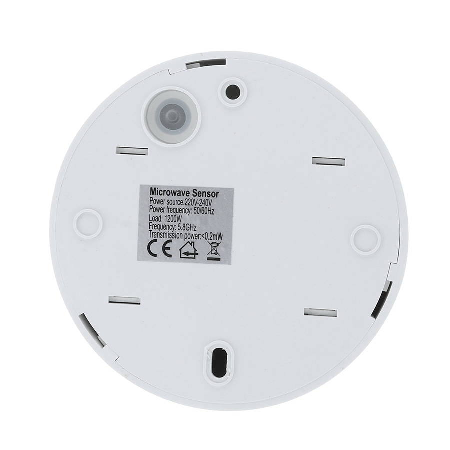 Operating voltage: 220-240V/AC Transmission power: <0.2mW Rated load: 1200W (Max) Installation: Ceiling mounting Detection area: 2-10meters Detection angle: 360ᆪ Time setting: 10sec-30min Mounting height: Max. 3.5 m Light control: 10~2000lux Operating temperature: -35a~+80a Microware frequency: 5.8GHz +/-75MHz Product size(L*W*H): 95*95*43mm Power consumption: <0.5W