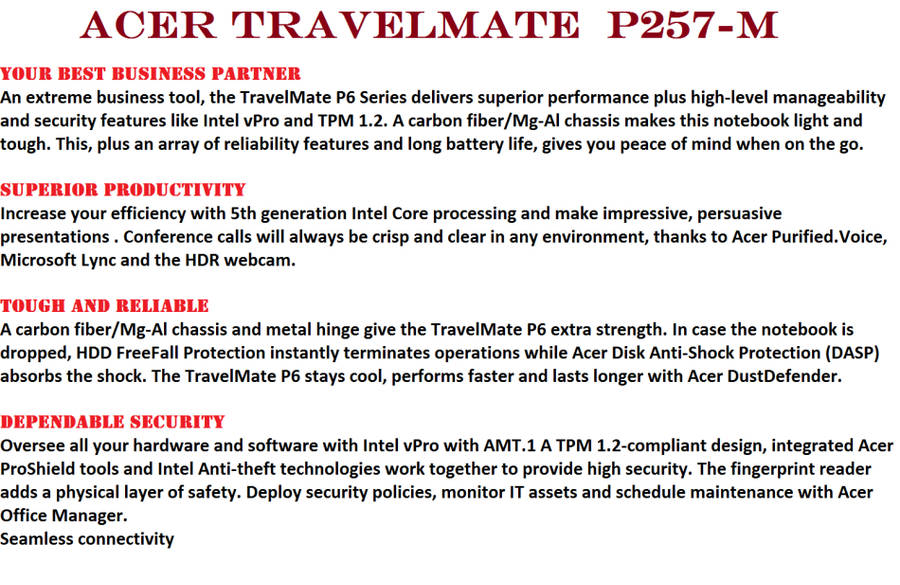 ACER TRAVELMATE P257 , CORE I5-5200U @2.20GHz ,8GB RAM , 1TB HDD , INTEL HD GRAPHICS ACER TRAVELMATE P257 , CORE I5-5200U @2.20GHz ,8GB RAM , 1TB HDD , INTEL HD GRAPHICS ACER TRAVELMATE P257 , CORE I5-5200U @2.20GHz ,8GB RAM , 1TB HDD , INTEL HD GRAPHICS