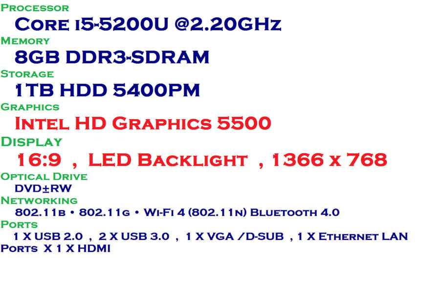 INTEL CORE I5-5200U @2.20GHz, 8GB RAM ,1TB HDD