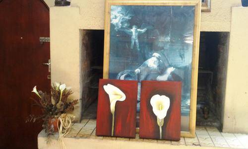 ACRYLIC ON BLOCKED CANVAS (STILL LIFE: ARUMS TR1) SIGNED BY ARTIST MARIE