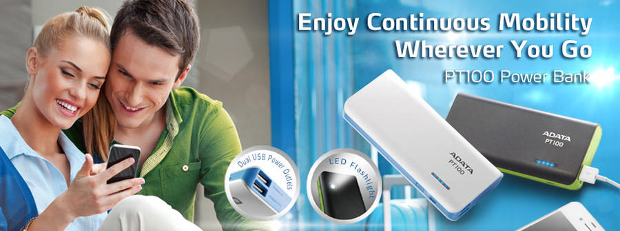 Product Overview The AData PT100 Power Bank offers high-capacity 10000mAh charging via two USB outlets. Charge your smartphone and tablet simultaneously and quickly. Use your AData PT100's handy LED flashlight to light up your mobile life! The AData PT100 includes ODP (Over-Discharge Protection), OCP (Over-Current Protection), SCP (Short Circuit Protection), OVP (Over-Voltage Protection) and OCP (Overcharge Protection) to protect the battery and the device you’re charging. As an extra safety feature, the ADATA PT100 automatically turns off if your device is idle, disconnected or fully charged.