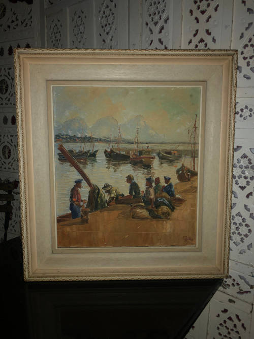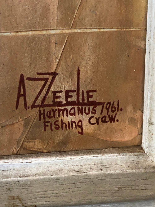 ADELIO ZAGNI ZEELIE (SA 1911 - 1991 ) GORGEOUS FRAMED OIL ON BOARD - SEASCAPE TITLED "HERMANUS FISHING CREW" AND DATED 1961 - LIGHT / FINE CRACKLE IN PLACES AS PER PICS