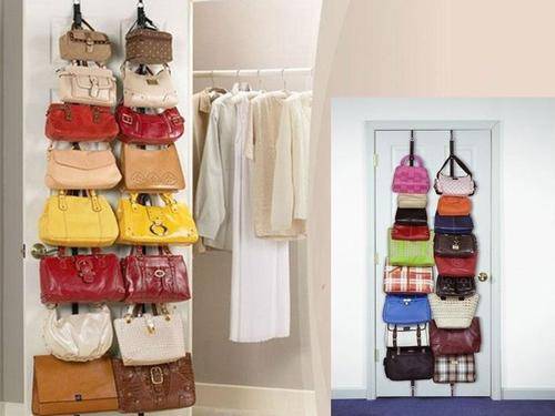 Protects and organize your bags. Over the door or wall mounting options. Holds bags, purse, scarves and hats. Adjustable hooks can be moved to fit any spacing. Holds 16 items totally. Color: Black.