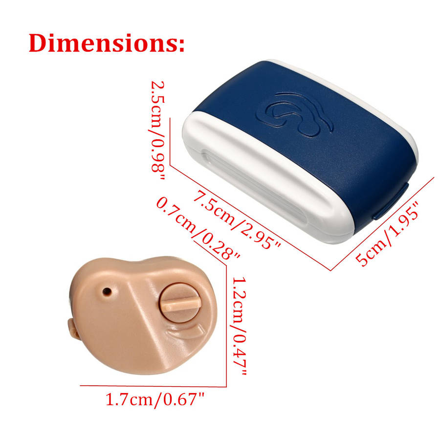 Hearing Aid Sizes: (L)X(W)X(H) 1.7x1.2x0.7cm /0.67"x0.47"x0.28"(appr.)