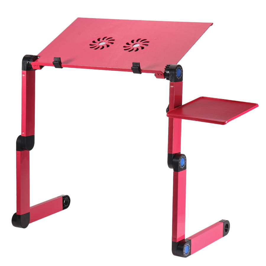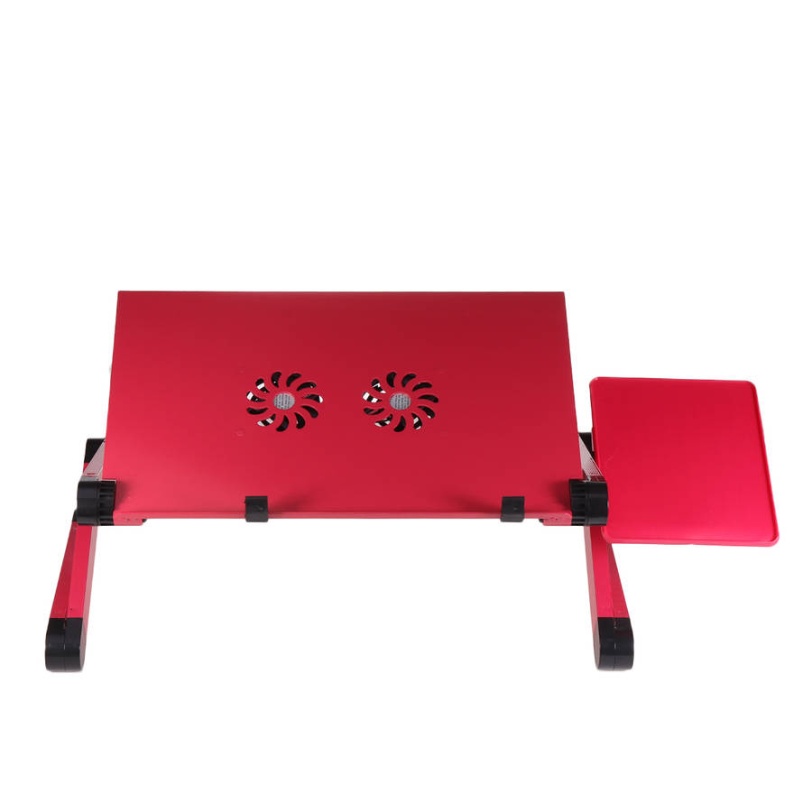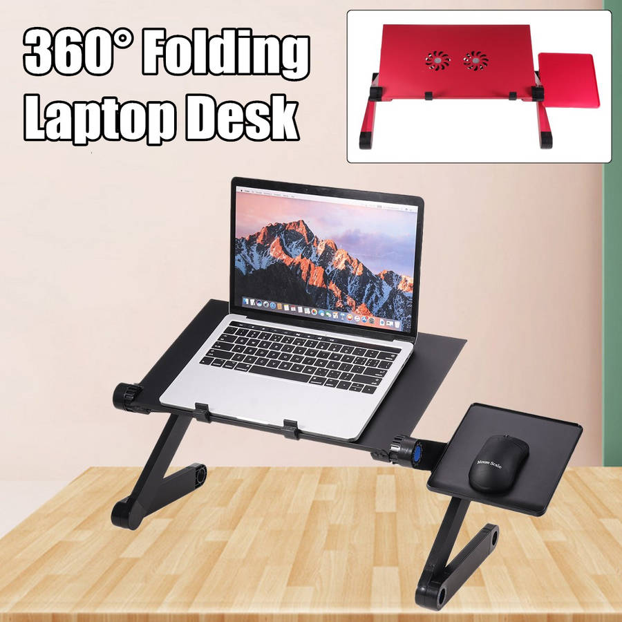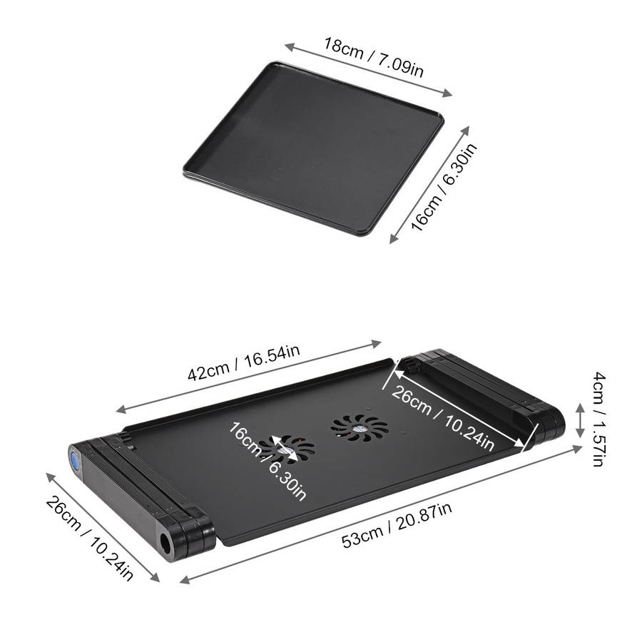 Material: Aluminum Alloy + ABS Color: Black / Rose Red (optional) Folding Angle: 360ᆪ Adjustable Angle: 360ᆪ Load Bearing: 15kg / 33lb Fan QTY: 2 (5V) Fan Noise: 25dB Fan Speed: 800RPM Fan Volume: Max 94CFM Compatible Laptop Size: < 17 in Fan Diameter: 16 cm / 6.30 in Adjustable Height: 48 cm / 18.90 in Mouse Tray: 18 x 16 cm / 7.09 x 6.30 in Leg Length: 26 cm / 10.24 in (each section) Panel Dimension: 42 x 26 cm / 16.54 x 10.24 in Folded Dimension: 53 x 26 x 4 cm / 20.87 x 10.24 x 1.57 in Features: a This is a laptop desk with 360 degree folding design. a You can use it on bed, sofa, table, carpet, and outdoors. a Made of aluminum material, durable and sturdy structure. a Used as laptop desk, writing desk, sketchpad, dinning table, etc. a Convenient to fold and open, easily store for space saving when not in use. a Each folding leg has 3 knobs which can adjust any height and angle you need. a Installed with two fans dissipate the heat from bottom of your notebook. Not only a table but also a cooler. Package Included: 1 x Folding Laptop Desk 1 x Mouse Tray 1 x Washer 1 x Star Knob 2 x Edge Stopper 1 x USB Cable 1 x Instruction (other decorations NOT included)
