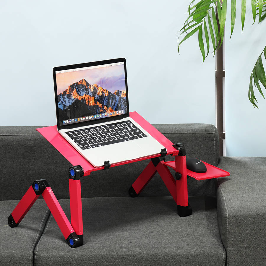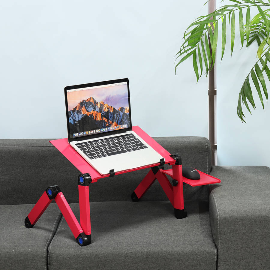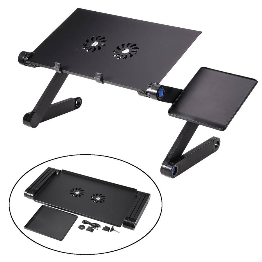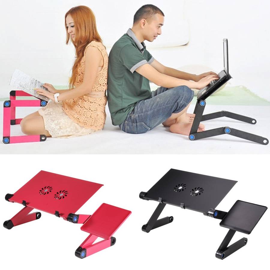 Material: Aluminum Alloy + ABS Color: Black / Rose Red (optional) Folding Angle: 360ᆪ Adjustable Angle: 360ᆪ Load Bearing: 15kg / 33lb Fan QTY: 2 (5V) Fan Noise: 25dB Fan Speed: 800RPM Fan Volume: Max 94CFM Compatible Laptop Size: < 17 in Fan Diameter: 16 cm / 6.30 in Adjustable Height: 48 cm / 18.90 in Mouse Tray: 18 x 16 cm / 7.09 x 6.30 in Leg Length: 26 cm / 10.24 in (each section) Panel Dimension: 42 x 26 cm / 16.54 x 10.24 in Folded Dimension: 53 x 26 x 4 cm / 20.87 x 10.24 x 1.57 in Features: a This is a laptop desk with 360 degree folding design. a You can use it on bed, sofa, table, carpet, and outdoors. a Made of aluminum material, durable and sturdy structure. a Used as laptop desk, writing desk, sketchpad, dinning table, etc. a Convenient to fold and open, easily store for space saving when not in use. a Each folding leg has 3 knobs which can adjust any height and angle you need. a Installed with two fans dissipate the heat from bottom of your notebook. Not only a table but also a cooler. Package Included: 1 x Folding Laptop Desk 1 x Mouse Tray 1 x Washer 1 x Star Knob 2 x Edge Stopper 1 x USB Cable 1 x Instruction (other decorations NOT included)