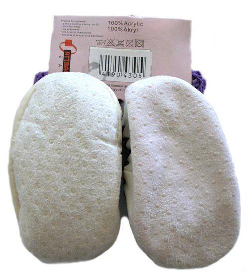 They have a soft white base with rubber grips, cream faux leather sides, stripey pink and purple knitted woolen tops and a cute little soft dog on the end of the foot (5.5cm across by 4.5cm high)