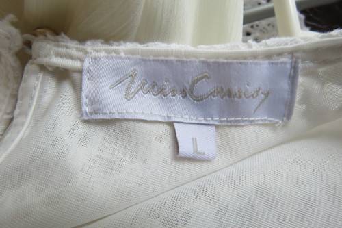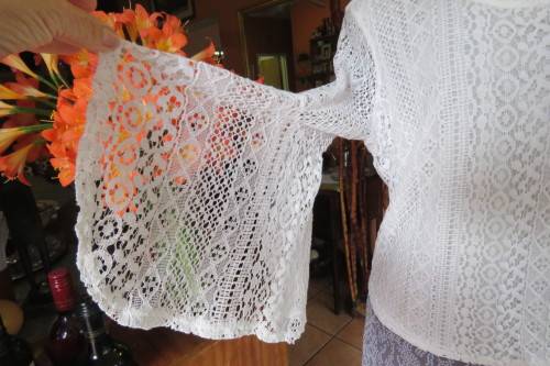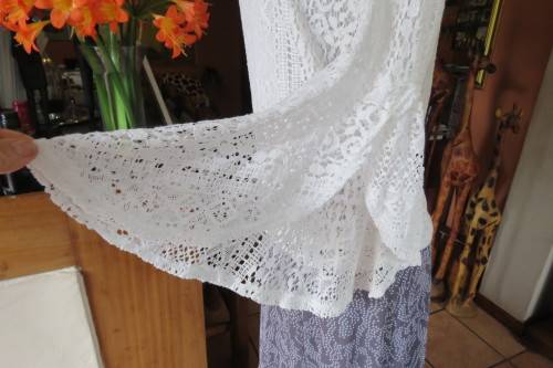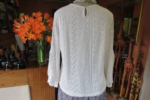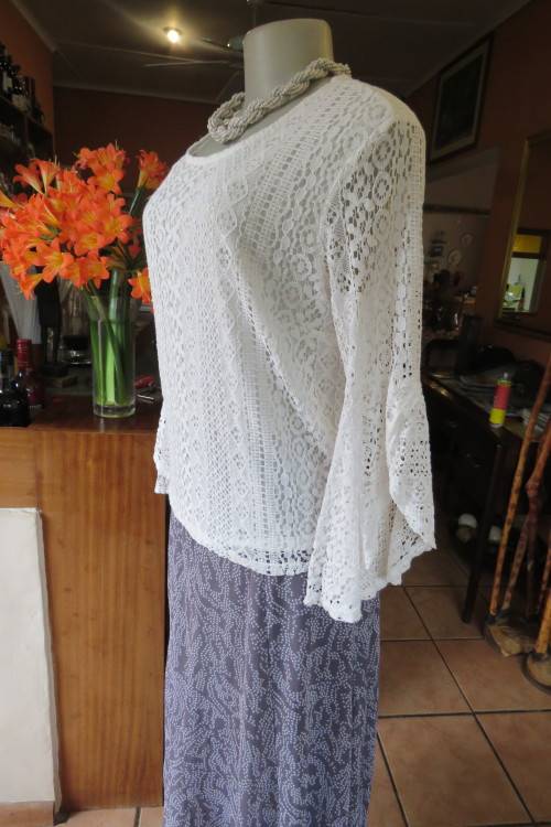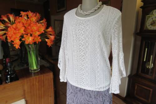 Adorable white lace top with angel sleeves in size 38/14 by MISS CASSIDY.In cotton and nylon lace fabric.Body lined with polyester.Sleeves see-through.Slip on style with short opening at back.Close with button and loop.Bought wrong size.New cond.Used once.