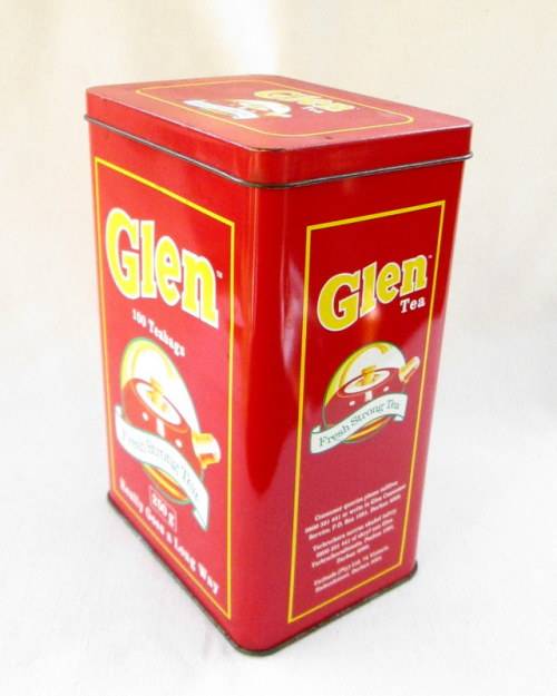 A lovely Glen Tea advertising hinged tin, in good condition, minor wear, size 13 cm x 9 cm x 19 cm.
