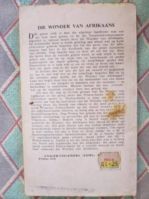 geen datum van druk sagteband 96 bladsye, die sagteband is verweer- verskeie merkies en ligte skade aan die rugkant, voorste skutblad is verwyder,heelwat vlekkies in boek, teks is skoon en die binding goed- sal boek beskryf as ietwat verweer- geen oorsese versending