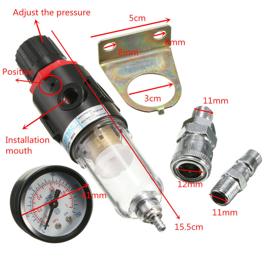 Features: Air filter regulator is that adjust The main channel of air pressure to a pressure value what the control device required after filtration through decompression. No matter the size of the inlet pressure and flow fluctuations, always maintain a stable outlet pressure. Light weight, small size, easy installation and maintenance. Can filter small particles, keep the air clean. If the output pressure is higher than the set pressure, the discharge pressure of the atmosphere to maintain a stable output. Gauge, mount, fittings (hose connector & quick connector) included. Recommend Regulating Pressure Range: 30-120PSI Max Regulator Pressure: 130PSI Regulator Inlet & Outlet Port Size: 1/4 BSP Particulate Filtration: 40micron Max Flow Rate: 26CFM (750 L/Min) Max Press: 9.9Kgf/cm2 Package Included: 1 x 1/4 Air Compressor Filter Set