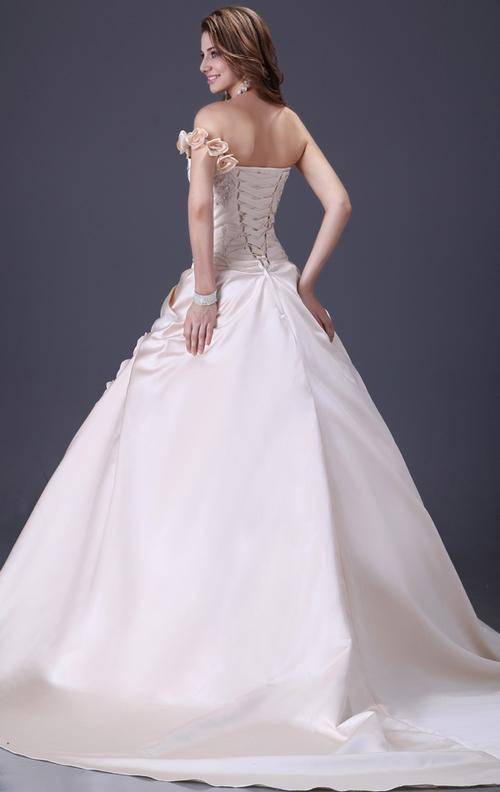 TECHNICS: dress has Lase up back, hand beaded deco, ROSES, watteau train