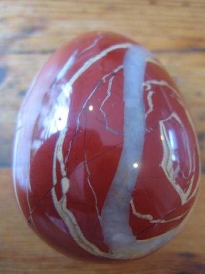 I challenge you to find more beautifully formed 100% natural blood red jasper anywhere in the world than in the Northern Cape, South Africa. Sold from the source so you get a better deal. Delicate bands of snow white quartz crystal. The blood red content is due to the high iron content of this jasper. The egg weighs 126 grammes which is about 4.5 ounces and is 5.2 cm high (over 2 inches) and 4 cm wide.