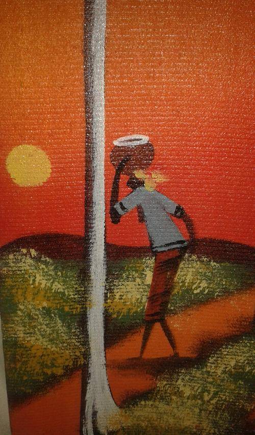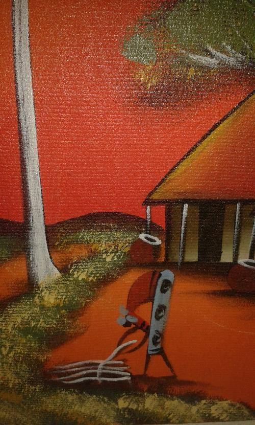 A beautiful African sunrise or sunset painting with vibrant colours portraying a tribal village and its inhabitants at work.