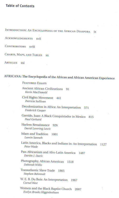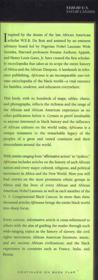 Ref 483 Africana by Kwane Anthony Appiah and Henry Louis Gates - The Encyclopedia of the African and the African American Experiance Hard Cvr 1999 ISBN 0 465 00071 1 many colour illustrations and photos Published by Basic Civitas Books Prc R250 [ plus R90 postage from Durban ] Mkt Prc R850 Condition : fly Leaf good -has a small 1cm tear top left side & bottom of fly slightly worn : Book Cover – excellent Inside - good some of the pages at the front are folded / have heavy folds in the pages Size - 280mm x 220mm x 50mm thick weight – about 3.7kg 2095pages